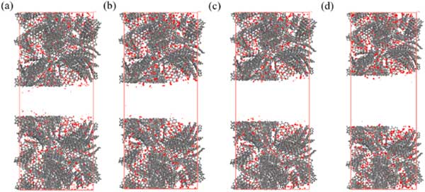 活性炭由微孔和介孔组成,介孔在一定程度上影响吸附特性。因此,研究芳烃在具有分级孔的活性炭上的吸附特性,以明确介孔对下一节吸附特性的影响。在这些模拟中,选择了密度为0.8g/cm3的微孔活性炭,不同样品的中孔尺寸分别选择为2.0、2.5、3.0和4.0nm。具有不同层次孔隙的活性炭。分层孔隙活性炭模型构建为密度在0.6-0.7g/cm3的合理范围内。图3展示了苯分子在p=10kPa下具有不同中尺度孔径的活性炭上的吸附位点分布。这表明即使在p=10kPa时,苯的吸附也仅发生在介孔表面,而不会填充介孔的空隙空间。图4说明了对二甲苯在具有3.0nm孔的活性炭上从低压到高压的吸附位点的变化。从图4(a)-(d)可以看出,只有微量的对二甲苯分子被吸附到微孔上,当压力为1.25kPa时,微孔逐渐被填满,中孔壁上出现吸附位点。当压力增加到3.75kPa时,吸附位点增加,介孔中开始出现多层吸附,最终介孔充满对二甲苯,此时压力可达6.25kPa。