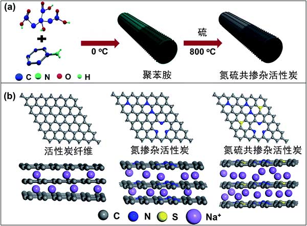 图1:(a)氮硫共掺杂活性炭合成的示意图,以及(b)具有不同几何构型和不同层间距离的三种活性炭对钠储存的行为。