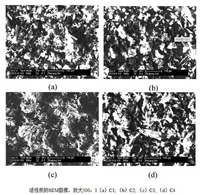 载体对于制备催化剂非常重要。载体的主要作用是均匀地分散和稳定小金属颗粒,从而提供比在相应的体金属中更多数量的催化活性原子,甚至当后者被接地以获得精细的功率时。催化剂制备的最重要参数是活性炭的孔隙率,孔径分布和表面积。粉末或颗粒的粒度分布,耐磨耗性和灰分含量也是重要参数。本研究比较了四种活性炭对催化剂的影响。通过电子显微镜观察的活性炭粉末的形态主要由原料决定。椰壳,木材和螺母基于活性炭容易识别的,因为起始材料的性质直接反映在最终产物中(图1)。直径约50μm的典型颗粒显示松散的结构,部分是由于所用原料的性质。以更高的放大倍数拍摄的C1,C2和C4显示出良好的大孔隙度。通过大孔,试剂分子到达小孔和位于碳颗粒内部的活性中心。C3显示密集结构。