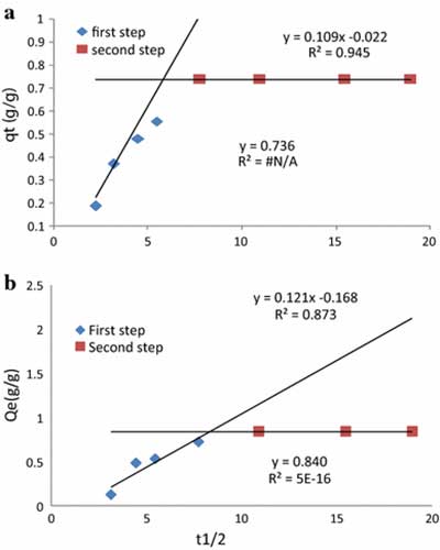 吸附机理粒子内扩散模型用于确定总体吸附速率是否通过颗粒内扩散来控制,即吸附物质分子进入活性炭孔隙内部。q t对t 1/2的曲线图给出如图3所示的线性关系 。截面(C)的值和斜率的粒子内扩散速率常数(Kid)的计算值总结在表中。较大的截距值表明,与表面扩散相比,颗粒内扩散具有较小的作用。该图显示在吸附过程中发生两个步骤。急剧上升的部分是外表面吸附阶段,而第二直线部分是逐渐吸附阶段,其中颗粒内或孔扩散是速率限制。急剧上升部分的高R 2值表明外表面吸附是速率限制步骤。线偏离原点和低R 2逐渐吸附阶段的值表明,颗粒内扩散不是唯一的限速步骤,因为早期报道了类似的结果。这意味着外表面的吸附或瞬时吸附阶段发生,并且可以被用来描述吸附过程的机构。