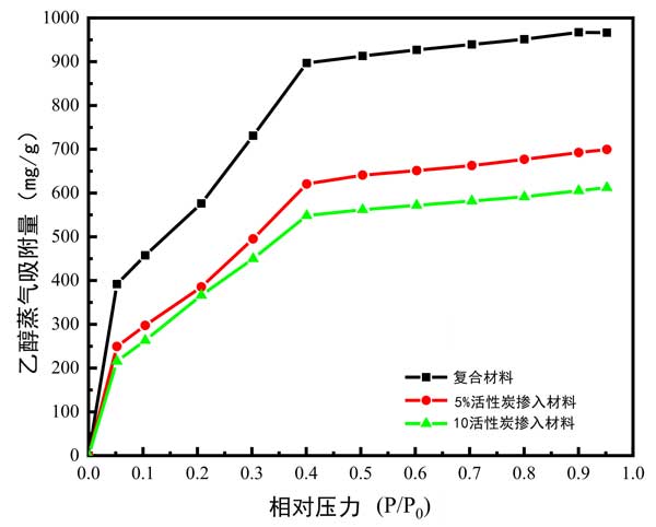 图3:复合材料和活性炭的掺入在30℃乙醇蒸气的吸附等温线。