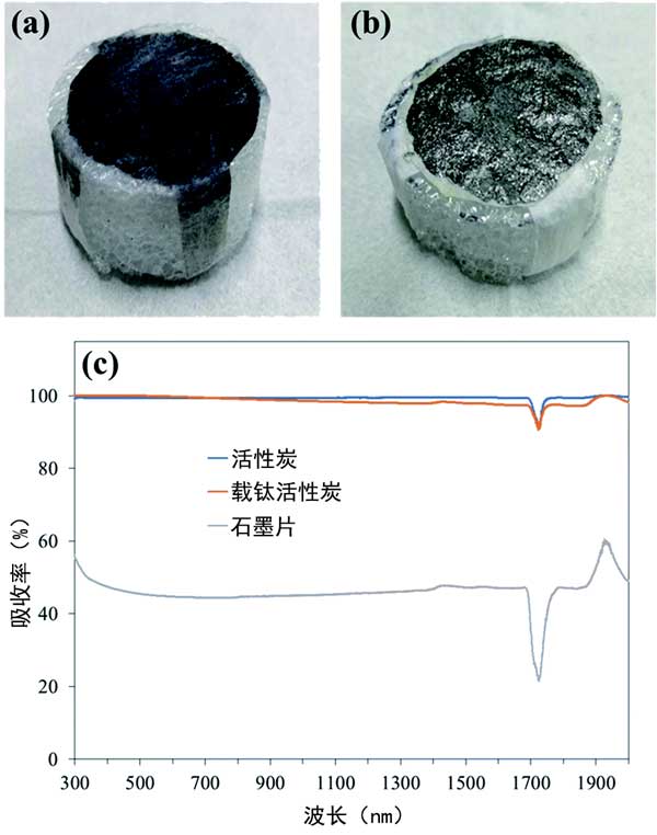 图1:(a)活性炭/泡沫和(b)石墨/泡沫的图片。(c)不同光热层的UV-vis-NIR吸收光谱。