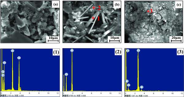 图2:活性炭和危废活性炭的SEM图像和EDS结果。(a)危废活性炭图像;(b,c)活性炭图像(1)CaSO4;(2)的SiO2;(3)KCl。