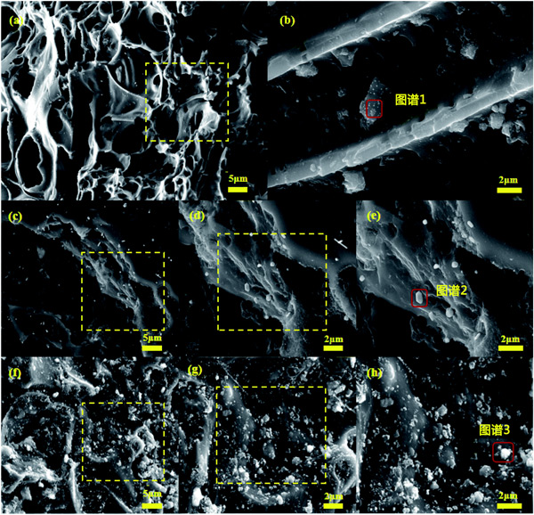 活性炭和锌盐失活催化剂的SEM图像在图2显示。从图2a和b可以看出,载铜活性炭催化剂具有良好的孔结构,不同尺寸的金属氧化物颗粒分布在催化剂表面。放大5000倍后(图2b),有利于反应气体吸附的孔结构仍清晰可见。图2c-e显示ZnCl2-活性炭催化剂的大部分表壁坍塌,孔结构严重受损,表明ZnCl2掺杂后活性炭结构强度降低。图2f-h表明ZnSO4-活性炭催化剂基体受到一定程度的破坏,表面粗糙,孔隙结构几乎看不到,仅在某些位置附着较大的金属氧化物颗粒,局部堆积。这种团聚现象发生在ZnSO4掺杂后的催化剂表面,不利于CO和NO气体的吸附,导致脱硝活性下降。
