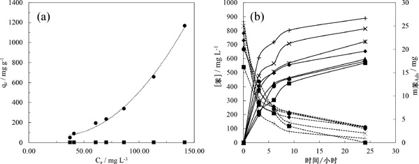 图3:苯在水和甲醇中的吸附等温线(a)和苯(b)在0.030L甲醇中不同量的活性炭中的吸附等温线。左轴甲醇上的苯浓度和右轴活性炭中剩余的苯质量。