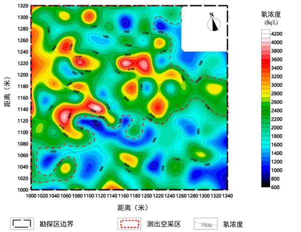 图2:活性炭测量的氡值等高线平面和采空区异常解释(红色线框)图。