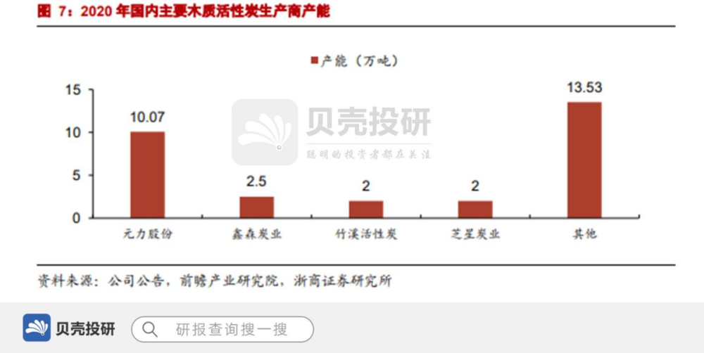 公司 2020 年木质活性炭系列产品产能达到 10.07 万吨,远远大于行业其他生产商。连续多年产销量位居国内第一,出口量连续超过十年第一。公司不仅生产规模遥遥领先,且木质活性炭技术、工艺优势明显。