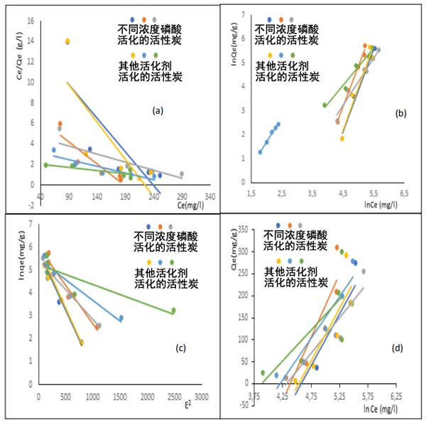 图3:根据Langmuir(a),Freundlich,(b)条件D-R-K,(c)和Temkin,(D)苯二胺在活性炭上的吸附等温线。