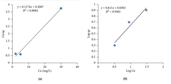 图2:活性炭上铅离子吸附的(a)Langmuir图和(b)Freundlich图。