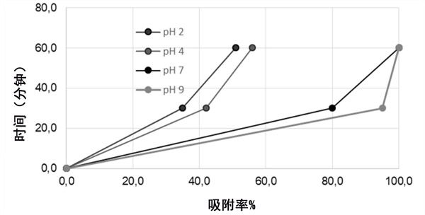 研究了pH值对三甲胺在活性炭上吸附的影响。在该过程中,发生吸附现象的溶液的pH值是非常重要的参数,尤其是在三甲胺为布朗斯台德碱的情况下。在官能团和吸附剂表面之间产生的静电荷的大小主要取决于介质的pH。在pH值为2、4、7和9的情况下,用0.200g的活性炭测量了在0、30和60分钟时三甲胺的吸附百分比,结果总结在图3中。