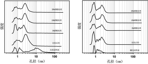 图3:用硝酸和活化处理的活性炭的孔径分布。
