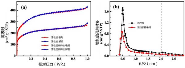 图2:(a)氮吸附-解吸等温线和(b)活性炭材料的孔径分布。