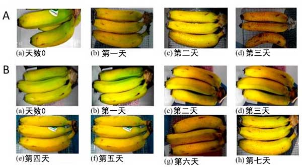 图3A,B分别显示了在没有和使用氧化钴浸渍的活性炭在封闭存储期间的水果条件的日常记录。使用活性炭15%氧化钴材料,进行半定量检查(即颜色和棕色区域)。当棕色主要出现时,长期保存时间被定义,并且香蕉从束中掉出来。当将香蕉存放在没有活性炭吸附剂的封闭盒子中时,水果很快变得腐烂。仅在第三天,一束香蕉已经从束中掉出来并出现棕色斑点。使用活性炭吸附剂情况下,可以清楚地看到水果保存时间的延长。相对于没有活性炭,颜色的变化被延迟(图3B)。结果表明氧化钴浸渍的活性炭作为乙烯清除剂在储存系统中的效果,因此延长了水果的储存寿命。