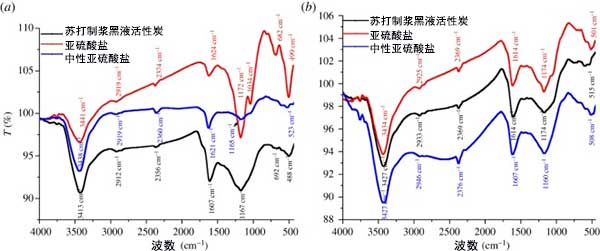 FTIR光谱和SEM在表面功能基团并根据该制浆工艺的研究基于活性炭的形态学的变化在图2示出。关于FT-IR光谱(图3a,b),很明显活性炭的表面具有强带,其分配为酚木质素,羧酸或吸附水的OH伸缩。因为苏打制浆导致从原料中更高的二氧化硅去除,并且因此黑液中的二氧化硅含量更高。发现不同官能团为特征的活性炭表面已准备好进行吸附过程。