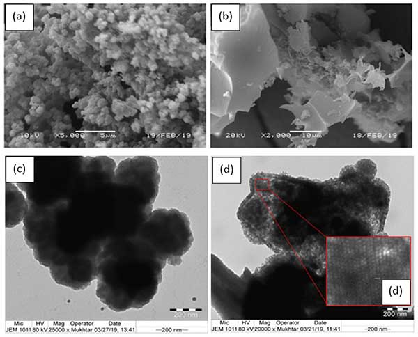使用SEM,TEM,TGA和XRD分析活性炭的表面形态,热性质和结晶度。用作活性炭前体的图像(图1a,c)显示其典型的形态为花椰菜样结构,这种形态似乎是由于与其中掺杂地嵌入无序聚合链形成的。然而,聚吡咯的球形结构通过碳化过程被破坏,导致粗糙,粗糙的表面由不规则的尖角和剥离状颗粒组成,在SEM图像中几乎没有孔隙的迹象。活性炭聚吡咯的TEM图像如图1d所示表示观察到均匀分布的微孔。此外,TEM图像描绘了高度丰富和对称的孔隙,表面积和微孔率的值对应于该活性炭。发现随着活化剂用量的增加,表面积增加,孔隙率增加。