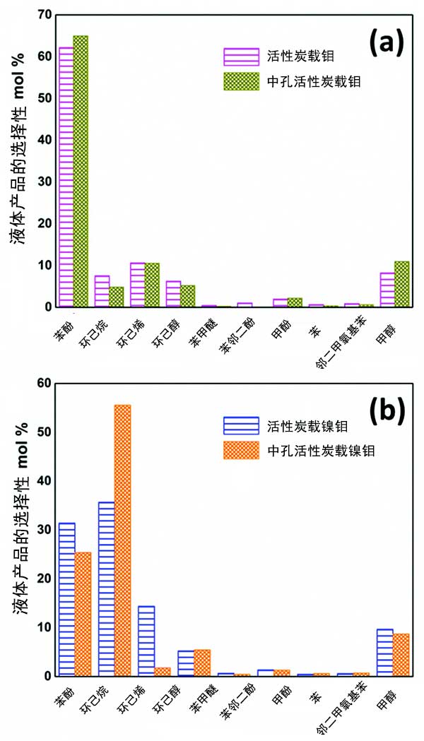 图1:(a)活性炭载二硫化钼催化剂(b)活性炭载镍催化剂用于转化愈创木酚的液体产物选择性和转换后的比较。