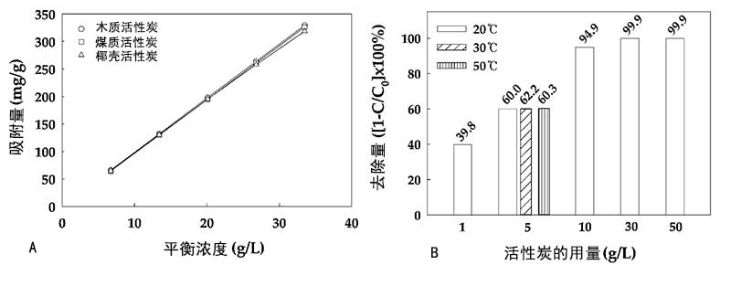 图3:(A)作为平衡浓度的吸附量取决于不同类型的活性炭,(B)活性炭的含量对去除效率的影响。