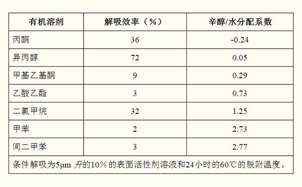 七种有机溶剂解吸效率表示与图1。实验条件5米升的10%的表面活性剂溶液和60℃24个小时解吸温度。的有机溶剂的解吸效率是3%,72%,9%,3%,32%,2%,而对于丙酮,异丙醇,甲基乙基酮,醋酸乙酯,二氯甲烷,甲苯,和3%的米二甲苯。