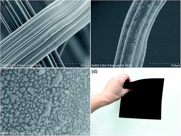通过FESEM表征活性炭和载铁活性炭的微观结构。图2(a)显示活性炭的SEM图像。活性炭的表面相对光滑,表面上没有表明残留杂质的颗粒。图2(b)和(c)显示了不同放大倍数下载铁活性炭的SEM图像。大多数Fe3 O4颗粒均匀分布在活性炭表面上。Fe3 O4颗粒的形状是不规则的,而它们的尺寸在15-60nm的范围内,这对应于从XRD图案计算的颗粒尺寸。图2(d)显示,所制备的载体活性炭易于弯曲,表明处理后具有良好的柔韧性。