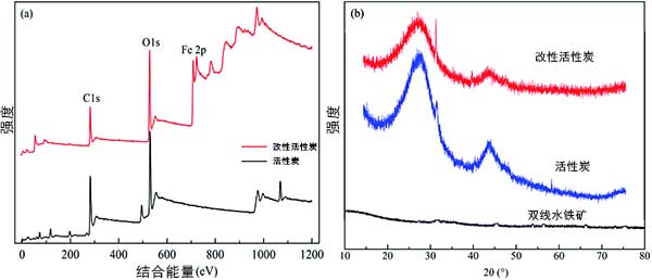 图2:活性炭和铁改性的XPS(a)和XRD(b)光谱。