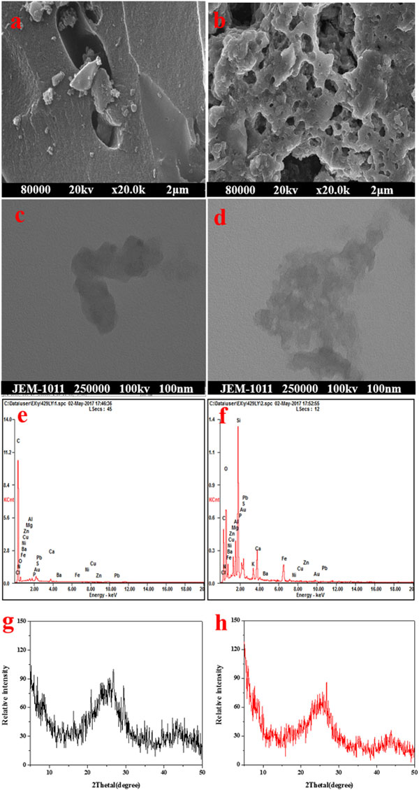 图1:两种吸附剂的代表性SEM,TEM和EDS图像。(a)活性炭的SEM(比例尺为2μm),(b)活性炭的TEM(比例尺为100nm),(c)活性炭的EDS,(d)改性活性炭的SEM(比例尺为2μm),(e)改性活性炭的TEM(比例尺为100nm),(f)改性活性炭的EDS,(g)活性炭的XRD,(h)改性活性炭的XRD。