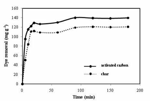 图3:接触时间对活性炭吸附甲基紫的影响(条件:初始浓度=100mg L-1,pH=9,活性炭剂量=0.6g L-1)。