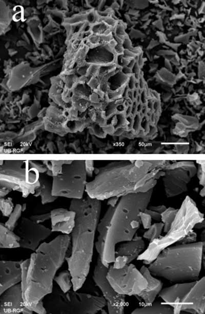图1。(a)放大350倍活性炭和(b)2000倍的活性炭的SEM显微照片。