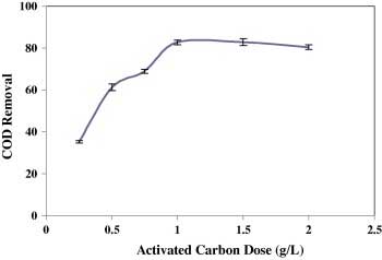 氧化处理后产生的污水仍然含有相当数量的有机物,如COD残留值(470 mg / L)。因此,采用后处理方法,通过使用活性炭,从处理后的废水流出物中除去残留的有机物质。活性炭从处理过的流出物中吸附有机化合物可能是由于溶质的疏水性。