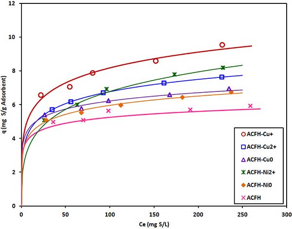 图3. 浸渍有不同铜和镍物种的活性碳纤维上4,6-DMDBT的吸附等温线。