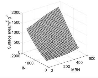 为了描述亚甲基蓝和碘的数量相对于表面积的行为,使用二次模型。对于模型开发,Kennard-Stone算法从105个样本中选择了27个样本并用于校准。样品表面积从199到2105 m 2 g -1不等。亚甲基蓝的数量在0到501毫克克每升之间,碘值从155到1670毫克克每升。建模后获得的表面拟合(图1)由公式4描述。