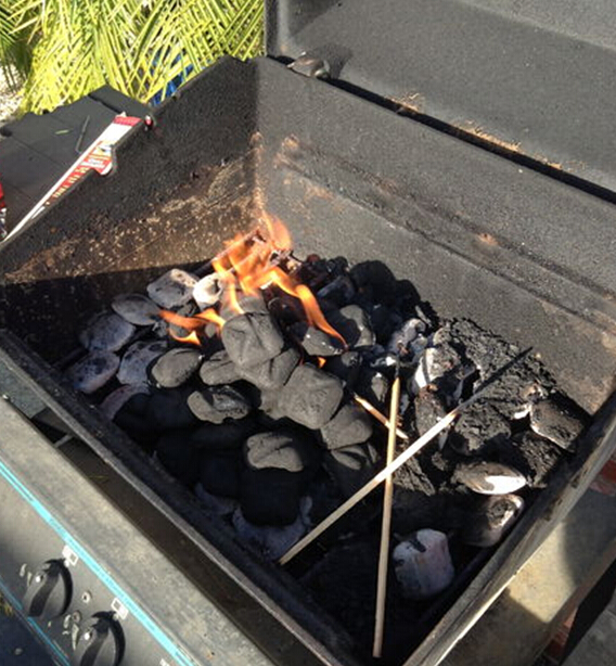 接下来,将容器放置在非常热的位置(也称为燃烧的火)。我们将我们放在燃烧的煤炭床上,这是一个即兴烧烤派对的好借口。你可以把它放在篝火的中心,或者在一个煤气灶中。这里的目标是保持400华氏度的温度, 即当热解和炭化开始时。过了一会儿,你应该看到蒸汽和气体从排气孔中排出,这只会增加火力。